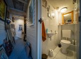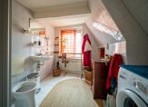 Aan de andere zijde van de overloop is de badkamer met een douche, toilet, wastafel, een open kast en de aansluitingen voor de wasapparatuur.