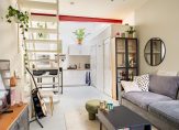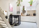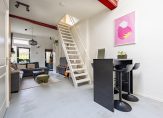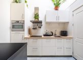 In de keuken met vide zorgt een groot dakraam voor veel lichtinval. Hier is de maximale hoogte bijna 7 meter, wat gerust verrassend genoemd mag worden. Er is ruimte voor een eettafel en de lichte wandopstelling is voorzien van een inductie kookplaat, afzuigkap, vaatwasser, combimagnetron en een koelkast met vriesvak.