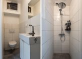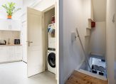 Rechts van de keuken zijn een kast voor de wasapparatuur en de badkamer. De vernieuwde badkamer is ingedeeld met een douche, wandcloset, een grote spiegel en een wastafelmeubel. Grote wand- en vloertegels vormen een mooie combinatie met de kranen en het sanitair.