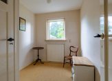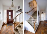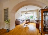 In de ruime, lichte hal ligt een bruine plavuizen vloer. Aan de linkerzijde zijn de sierlijke trapopgang, een trap naar de wijn-/provisiekelder en de toiletruimte. Ook de originele binnendeuren zijn behouden, wat zorgt voor een hal met sfeer.