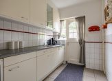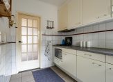 De dichte keuken, met lichte wand- en vloertegels, is vanuit de hal te bereiken. Er staat een wandopstelling met hoge bovenkasten, onderkasten en enige inbouwapparatuur: een gaskookplaat, afzuigkap en een magnetron.