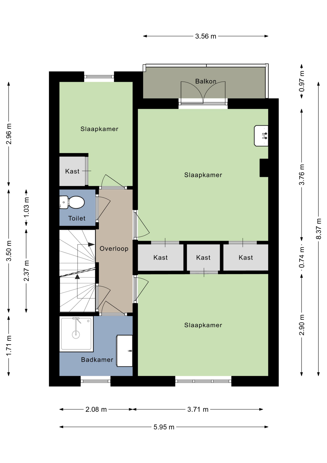 Er zijn drie slaapkamers op de eerste verdieping, waarvan twee aan de achterzijde. De eerste slaapkamer heeft een inbouwkast en de tweede is de masterbedroom met twee inbouwkasten, een wastafel en een balkon. Aan de voorzijde is de derde slaapkamer, met een inbouwkast en mooi uitzicht naar de mooie straat. De badkamer, aan de voorzijde, is ingedeeld met een douche en een wastafelmeubel. Het toilet bevindt zich in een aparte ruimte, te bereiken vanaf de overloop. Bij deze ruimtes zijn, net als bij de slaapkamers, de paneeldeuren behouden.