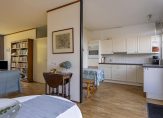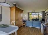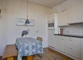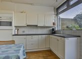In de halfopen keuken staat een lichte hoekopstelling met een keramische kookplaat, afzuigkap, oven en een koelkast. De keuken is naar wens te moderniseren en de ruimte hiervoor biedt veel mogelijkheden.