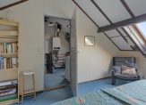 Een vaste trap geeft toegang tot de tweede verdieping, waar een ruime overloop/wasruimte en de vierde slaapkamer zijn. Op de overloop hangt de HR-ketel en de slaapkamer heeft niet alleen een groot dakraam, maar ook een diepe berging in de schuinte van het dak.