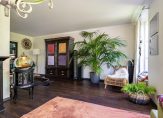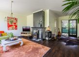 In de woonkamer zorgen de brede erker en grote ramen voor mooi uitzicht naar de voortuin. Het zitgedeelte is bij de houtkachel, en het andere deel van de woonkamer is thans ingedeeld met een grote kast en een zitje bij het raam. Sfeermakers in de woonkamer zijn de parketvloer, de schouw met kachel en de subtiele plafondlijsten.