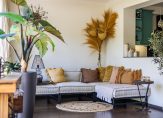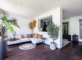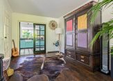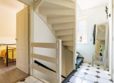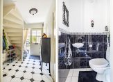 Aan het einde van de oprit is de overdekte entree, die toegang geeft tot de lichte hal van deze verrassende woning. De tegelvloer past goed bij de binnendeuren en aan de linkerzijde is de toiletruimte met fonteintje. Ook is er een handige bergkast in de hal, net voordat je de woonkamer in loopt.