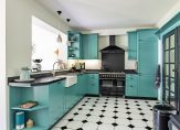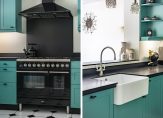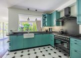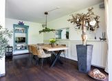 Achter de zwarte deuren met glas is de woonkeuken, met een zitgedeelte aan de tuinzijde en een royaal eetgedeelte vlak naast de keuken. Sfeermakers zijn de parketvloer, de lambrisering bij het eetgedeelte en het optimale uitzicht naar de tuin. In de keuken staat een stijlvolle hoekopstelling in een opvallende kleur, met een grote spoelbak en een zwart composiet aanrechtblad. Het Boretti gasfornuis met ovens is een plaatje en de afzuigkap, vaatwasser, koelkast en vriezer zijn ingebouwd.