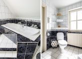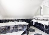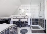De badkamer is ingedeeld met een ruim bad, een aparte douche, twee wastafels en een toilet. Bij het bad is een verhoging gemaakt en de spiegels zijn in de vorm van een driehoek, goed passend bij het schuine dakvlak.