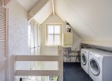 Met een nokhoogte van ruim 2.50 meter is de tweede verdieping een volwaardige etage. Op de overloop, bij de HR-ketel, is de opstelling van de wasapparatuur. Aansluitend is de vierde slaapkamer, met twee dakramen en bergruimte in de schuinte van het dak. Bergruimte is er ook achter de louvredeuren, waardoor er genoeg plek is voor de koffers en andere spullen.