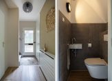 Onder de carport is de entree van deze woning, die veel ruimer is dan de voorzijde doet vermoeden. Eenmaal binnen sta je in de hal die, net als de rest van de woning, smaakvol is verbouwd. Aan de rechterzijde zijn de trapopgang en de stijlvolle toiletruimte, ingedeeld met een wandcloset en fonteintje.