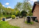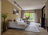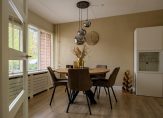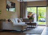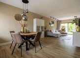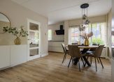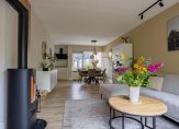 De bijna 9 meter lange woonkamer is het toppunt van sfeer, mede dankzij de kleuren op de muren die goed passen bij de pvc-vloer met houtmotief. Aan de achterzijde, bij de Contura houtkachel, is het royale zitgedeelte met uitzicht naar de tuin en het water. Het eetgedeelte bevindt zich aan de voorzijde, vlak naast de keuken.