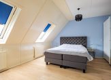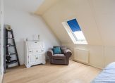 Aan de achterzijde zijn twee slaapkamers samengevoegd tot een zeer ruime master bedroom, met twee dakramen aan de achterzijde. De tweede slaapkamer, in gebruik als kleedruimte, is aan de voorzijde. In beide slaapkamers ligt laminaat en op de overloop, net als de trap naar de begane grond, ligt donkerblauw tapijt.