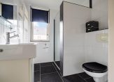 De badkamer is ingedeeld met een ruime inloopdouche, wandcloset, wastafelmeubel en een handdoekenradiator. Nu zie je de kleuren wit en zwart, met de mogelijkheid om met handdoeken en accessoires je eigen sfeer aan de badkamer te geven.