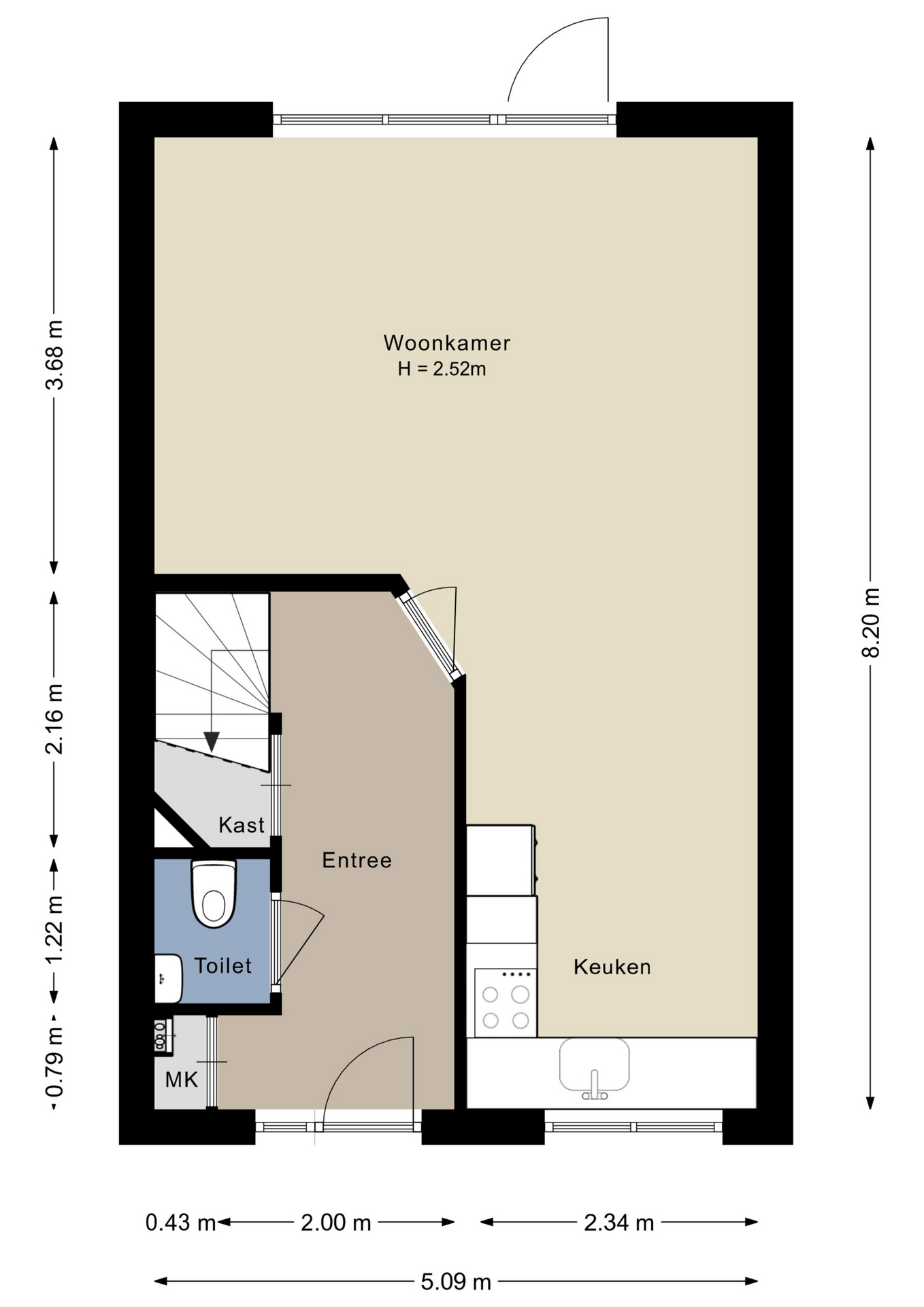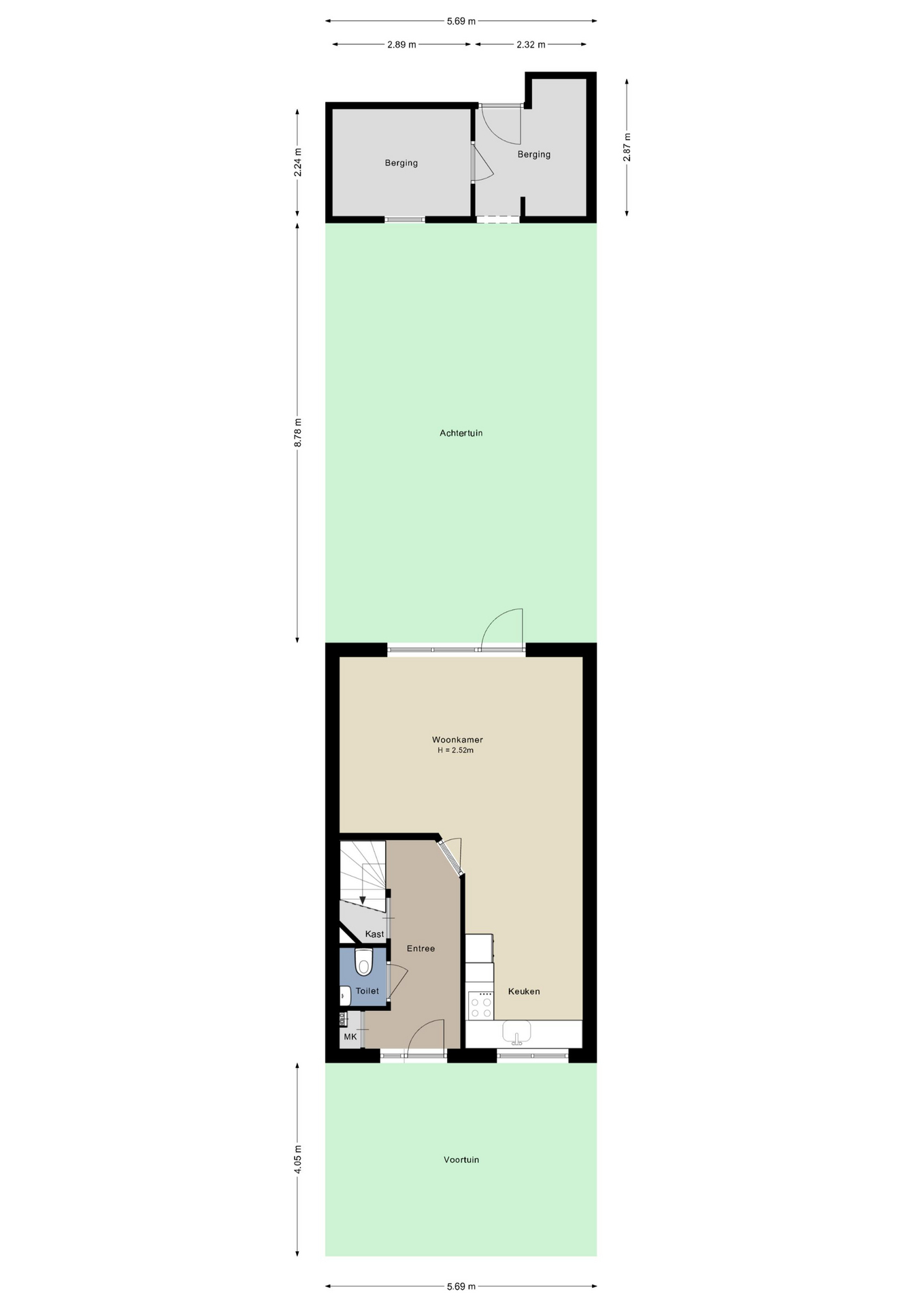 De woning, met twee etages, is een opvallende verschijning in de straat. Een deel van het houtwerk, waaronder de voordeur en de overkapping, is donkergroen geschilderd. Achter deze voordeur is de ruime hal, met de trapopgang en een mooie laminaatvloer. Onder de trap is een bergkast en de toiletruimte met fonteintje is uitgevoerd in lichte kleuren.