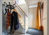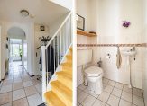 Als je thuis komt, zet je de auto op de oprit. Vervolgens loop je naar de voordeur en vervolgens de hal in. Aan de rechterzijde is de trap naar de eerste verdieping en aan de andere kant, naast de meterkast, is de toiletruimte met fonteintje.