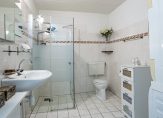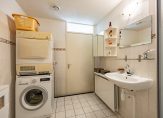 Naast deze slaapkamer is de badkamer, met lichte tegels op de wanden en vloer. De ruimte is ingedeeld met een douche (vernieuwd in 2018), een tweede toilet en een wastafel. Ook de wasmachine en droger kunnen in de badkamer staan.