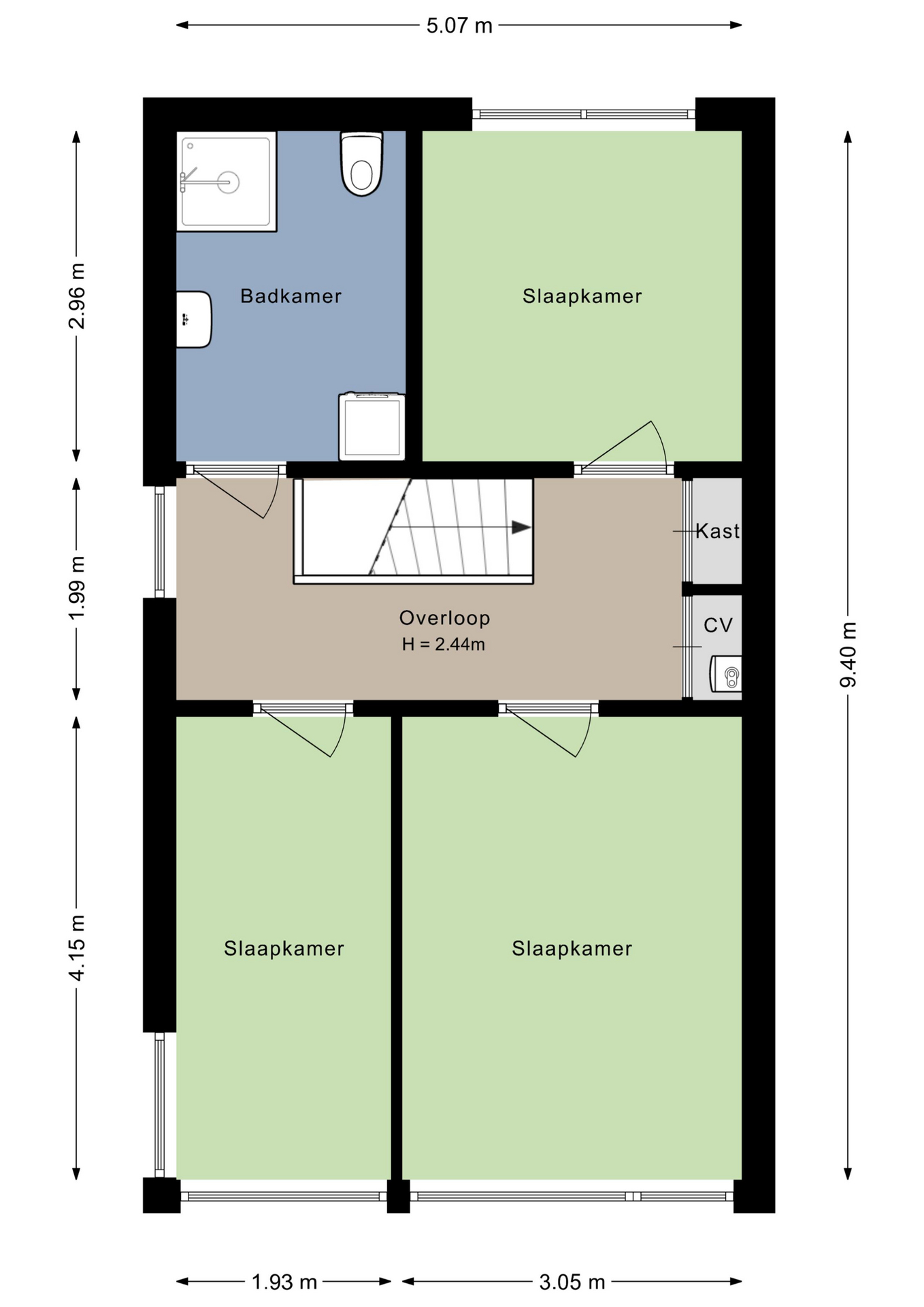 Niet alleen de begane grond, maar ook de eerste verdieping heeft een ruimtelijke indeling. Grote ramen zorgen voor veel lichtinval, op de overloop en in de slaapkamers. Vanaf de overloop is er onder andere toegang tot een inbouwkast en de cv-ruimte.