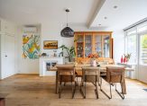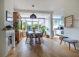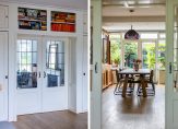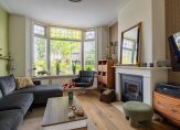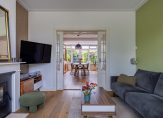 De 11 meter lange woonkamer is het toppunt van sfeer, mede dankzij de houten vloer en de en-suite deuren. Aan de voorzijde is de zitkamer, met een inbouwhaard en drie glas in lood bovenramen. Achter de schuifdeuren is de zeer ruime eetkamer, waar de plek van de haard wordt benut als boekenkast. Een grote pui met openslaande tuindeuren, aan de zonnige zuidwestkant, zorgt voor veel lichtinval. In de hoek van de eetkamer hangt een airco-unit, die kan koelen en verwarmen.