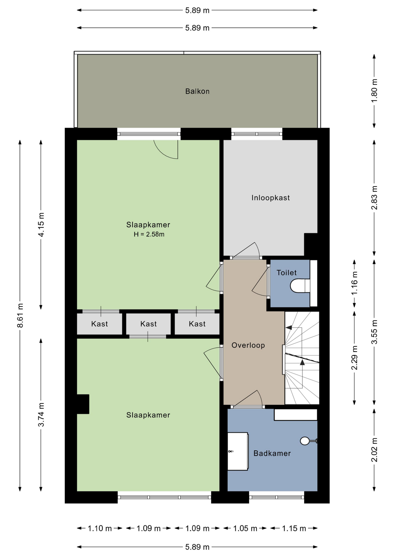 Er zijn drie slaapkamers op de eerste verdieping, waarvan een in gebruik is als kleedruimte. Inbouwkasten in de twee overige slaapkamers, met paneeldeuren, bieden ruimte aan kleding en andere spullen. De tweede slaapkamer cq werkkamer is voorzien van een airco en een sauna (deze is over te nemen). Vanuit de master bedroom is het bijna 6 meter brede balkon te bereiken, gesitueerd op het zuidwesten.
