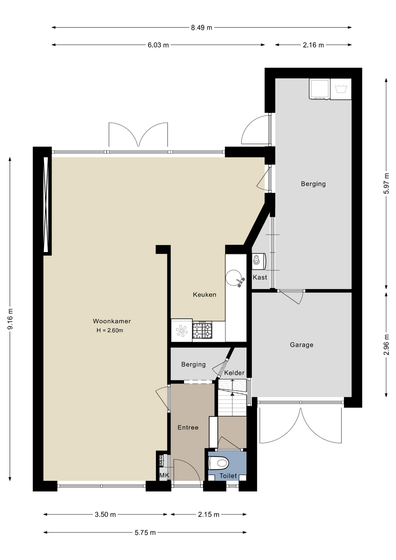 In de keuken staat een hoekopstelling met een houtlook blad. De gaskookplaat, afzuigkap, oven en vaatwasser zijn ingebouwd. Het is mogelijk om de keuken te vergroten, bijvoorbeeld richting de achtertuin. Vanuit de woonkamer is een ruime berging/bijkeuken te bereiken, met de HR-ketel en de aansluitingen voor de wasapparatuur. De inpandig te bereiken (fietsen)berging heeft dubbele deuren naar de oprit.