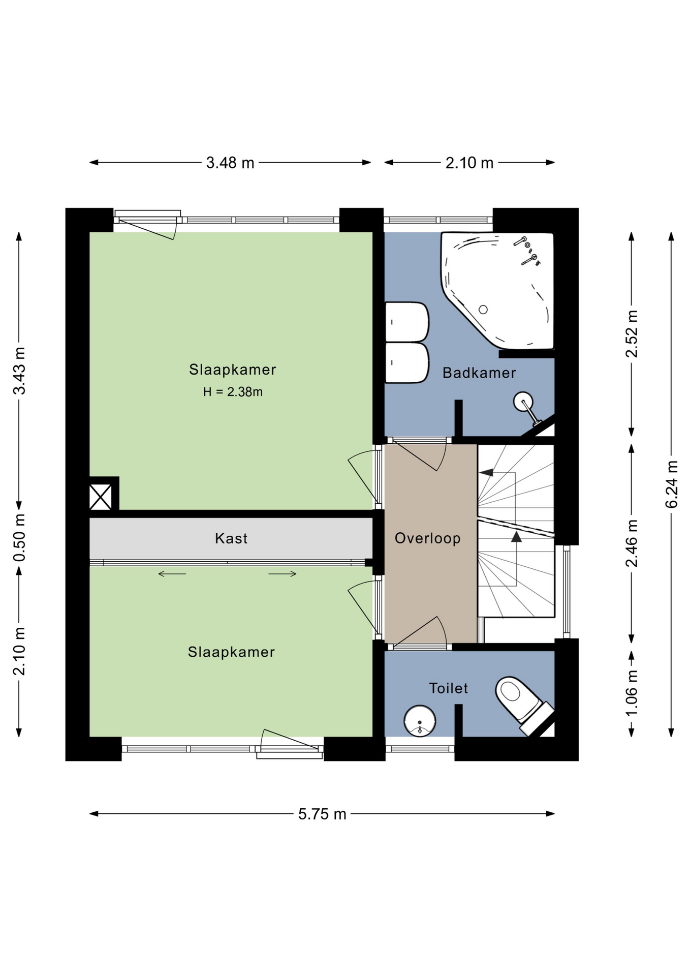 Het raam in de zijgevel zorgt voor veel lichtinval op de overloop, waar een vaste trap naar de tweede verdieping is. Verder zie je vier deuren die toegang geven tot een toiletruimte, de badkamer en twee ruime slaapkamers.