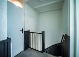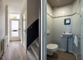 In de hal ligt, net als op de hele begane grond, een laminaatvloer in een grijstint. Naast de trap is de ruime toiletruimte met fonteintje en de kast onder de trap kan als garderobe worden gebruikt, waardoor er geen zichtbare jassen en schoenen in de hal zijn.