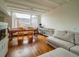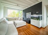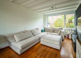 Grote ramen aan de oost- en westkant zorgen voor veel lichtinval in de L-vormige woonkamer. Het zitgedeelte is aan de voorzijde en het brede eetgedeelte, met uitzicht naar de tuin, is aan de achterzijde. De plafondbalken zijn wit geschilderd, er ligt parket op de vloer en bij het zichtbare metselwerk bij het zitgedeelte is gekozen voor trendy zwart.