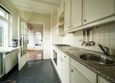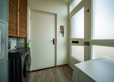 In de aanbouw zijn drie ruimtes, waaronder de keuken. Hier zie je vaste kasten met louvredeuren en een lichte wandopstelling met een gaskookplaat, afzuigkap, oven en een koelkast. In de bijkeuken is ruimte voor een extra koel-/vriescombinatie, de vaatwasser en de wasmachine. Verrassend is dat de bijkeuken een eigen entree heeft, wat de naastgelegen werkkamer geschikt maakt voor een ondernemer. Verbouw je de bijkeuken tot doucheruimte/badkamer, dan is het mogelijk om gelijkvloers te wonen.
