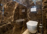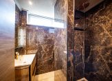 Dan de badkamer, geheel vernieuwd en met de juiste looks! Grote marmerlook tegels zijn gecombineerd met stijlvolle kranen en modern sanitair. De ruimte is ingedeeld met een inloopdouche, een toilet en een wastafelmeubel.