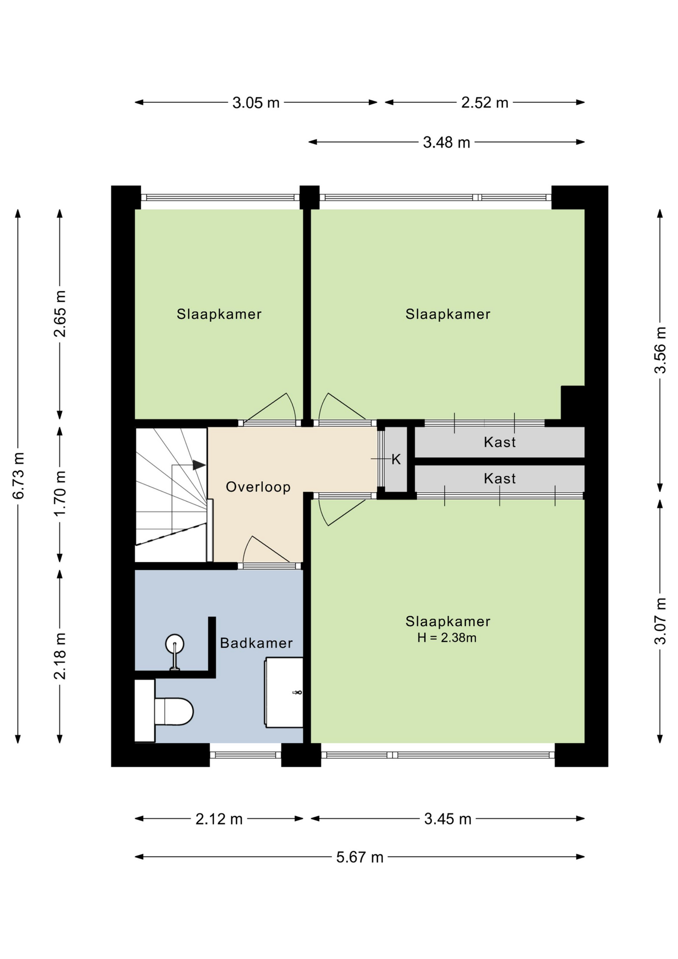 Vanaf de overloop zijn drie ruime slaapkamers en de badkamer te bereiken. De twee grootste slaapkamers zijn voorzien van een grote inbouwkast, voor kleding en andere spullen. In de slaapkamers en op de overloop ligt donkergrijs tapijt op de vloer en door de grote ramen valt veel licht naar binnen.
