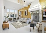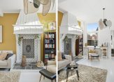 Een witte paneeldeur met glas geeft toegang tot de bijna 7.50 meter lange woonkamer, met een meer dan 3.10 meter hoog plafond en volop lichtinval vanaf twee kanten. Blikvanger is de haardpartij met schouw, die thans een decoratieve functie heeft. Aan de voorzijde is het eetgedeelte en het zitgedeelte strekt zich uit tot de achtergevel van het oorspronkelijke woonhuis. Deze woonkamer, met een mooie kleur op een van de lange wanden, lijkt zo uit een woonmagazine te komen.