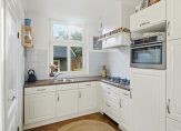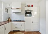 In de aanbouw is de keuken, met uitzicht op de tuin. De hoekopstelling met houtlook aanrechtblad is uitgevoerd in een lichte kleur, met een ronde spoelbak en verwarming in de plint. Je hebt de beschikking over een 5-pits gaskookplaat, een afzuiging met schouw, een vaatwasser, koelkast, vriezer en een combi-oven.