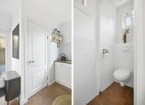 Naast de keuken is de toiletruimte, eveneens uitgevoerd in rustige kleuren. Het toilet is uitgevoerd als wandcloset en aan twee kanten is een raampje voor licht en ventilatie.