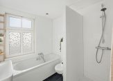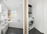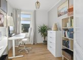 Aan de achterzijde zijn de tweede slaapkamer, in gebruik als werkkamer, en de badkamer. Hou je van een warm bad, of toch van een ruime douche? Deze badkamer heeft beiden! Verder zijn er een toilet, een wastafel en een nis voor de wasapparatuur.