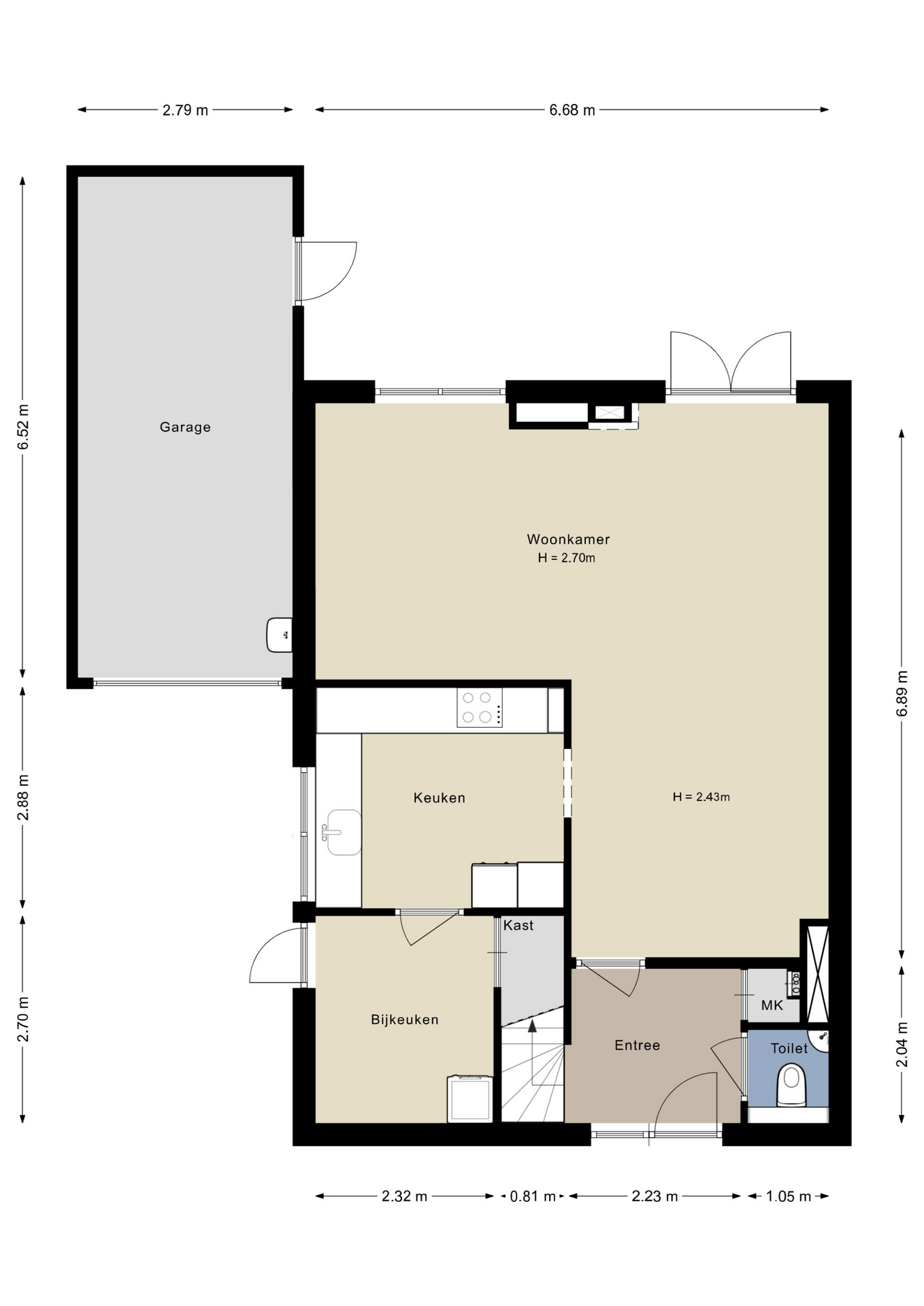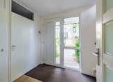 Nooit meer zoeken naar een parkeerplek, want bij deze woning kun je parkeren op eigen terrein. Vlak naast de oprit is de deur naar de bijkeuken, die de bewoners als dagelijkse entree gebruiken. De officiële entree is echter aan de voorzijde, onder het balkon. Achter de voordeur is de hal met de meterkast, trapopgang en de toiletruimte.