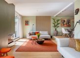 De L-vormige woonkamer heeft een speels niveauverschil, met de royale zitkamer op aan de tuinzijde. Je ziet niet alleen een dubbel raam, maar ook openslaande deuren waardoor veel licht naar binnen valt. Sfeermakers zijn de inbouwhaard, de kleuren op de gestucte muren en de parketvloer.