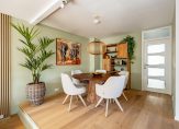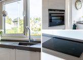 Het eetgedeelte grenst aan de keuken, die in 2015 is vernieuwd. Er ligt, net als in de woonkamer, parket op de vloer en het raam bij het spoelgedeelte biedt een mooi uitzicht naar de zijtuin. De royale hoekopstelling heeft een stijlvol, grijs aanrechtblad en de inductie kookplaat, afzuigkap en vaatwasser zijn ingebouwd. In een hoge kast vind je de combi-oven, koelkast en vriezer. Naast de keuken is de bijkeuken, met de opstelling van de wasapparatuur en een handige kast onder de trap.