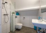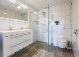 De badkamer is, net als de keuken en toiletruimte, in 2015 vernieuwd. Grote, witte wandtegels en grijze betonlook vloertegels vormen een fraai geheel. Naast het wandcloset is de ruime inloopdouche met een glazen wand, en het badmeubel met brede wastafel is voor twee personen.