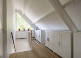 Wat je zeker niet verwacht, is de zeer ruime overloop. Nu staan er twee kasten en een fauteuil, maar een indeling als thuiswerkplek of studeerruimte is goed mogelijk. Erg fijn zijn de ramen aan twee zijden, waardoor veel licht naar binnen valt.