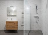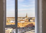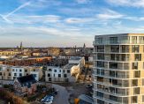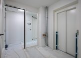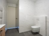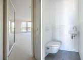 Dit fantastische appartement heeft twee slaapkamers aan de oostkant van het gebouw. Ook hier zorgen ramen tot vloerhoogte voor een uitstekende verbinding met de omgeving en uitzicht over een deel van Noorderhaven en de vele torens in de stad. Aan de andere kant van de hal zijn de toiletruimte met fonteintje, de inpandige berging en badkamer. In de berging is de opstelling van de technische installaties en is onder andere ruimte voor de wasapparatuur. De badkamer is heel ruimtelijk ingedeeld met een inloopdouche, tweede toilet en een wastafelmeubel met spiegelkast.