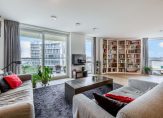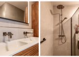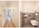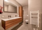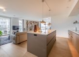 De laatste ruimte in het appartement is de badkamer, met prachtig tegelwerk en modern sanitair. Blikvanger is het dubbele wastafelmeubel, met een hoge zijkast en designkranen. De spiegel is voorzien van verlichting, er is een wandcloset geplaatst en de inloopdouche heeft een glazen wand met zwarte rand. Een plaatje!