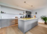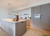 In de keuken staan een lange wandopstelling en een stijlvol eiland, met kasten aan de woonkamerkant en goede lades in de keuken. De aanrechtbladen geven de keuken een luxe uitstraling en alle benodigde apparatuur is ingebouwd: een inductie kookplaat met afzuiging, een vaatwasser, combi-oven en een koel-/vriescombinatie.