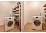 De hal is, mede dankzij de houtlook vloer, heel sfeervol. Aan de linkerzijde, naast de badkamer, is het gastentoilet en aan de rechterzijde is een inpandige berging. Hier kunnen de wasmachine, droger, wasmanden en andere spullen staan.