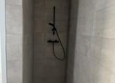 een luxe badkamer met douche, wastafel, toilet, een aparte toiletruimte en drie slaapkamers waarvan één toegang geeft tot een fraai dakterras van met uitzicht over de tuinen van de achtergelegen percelen.