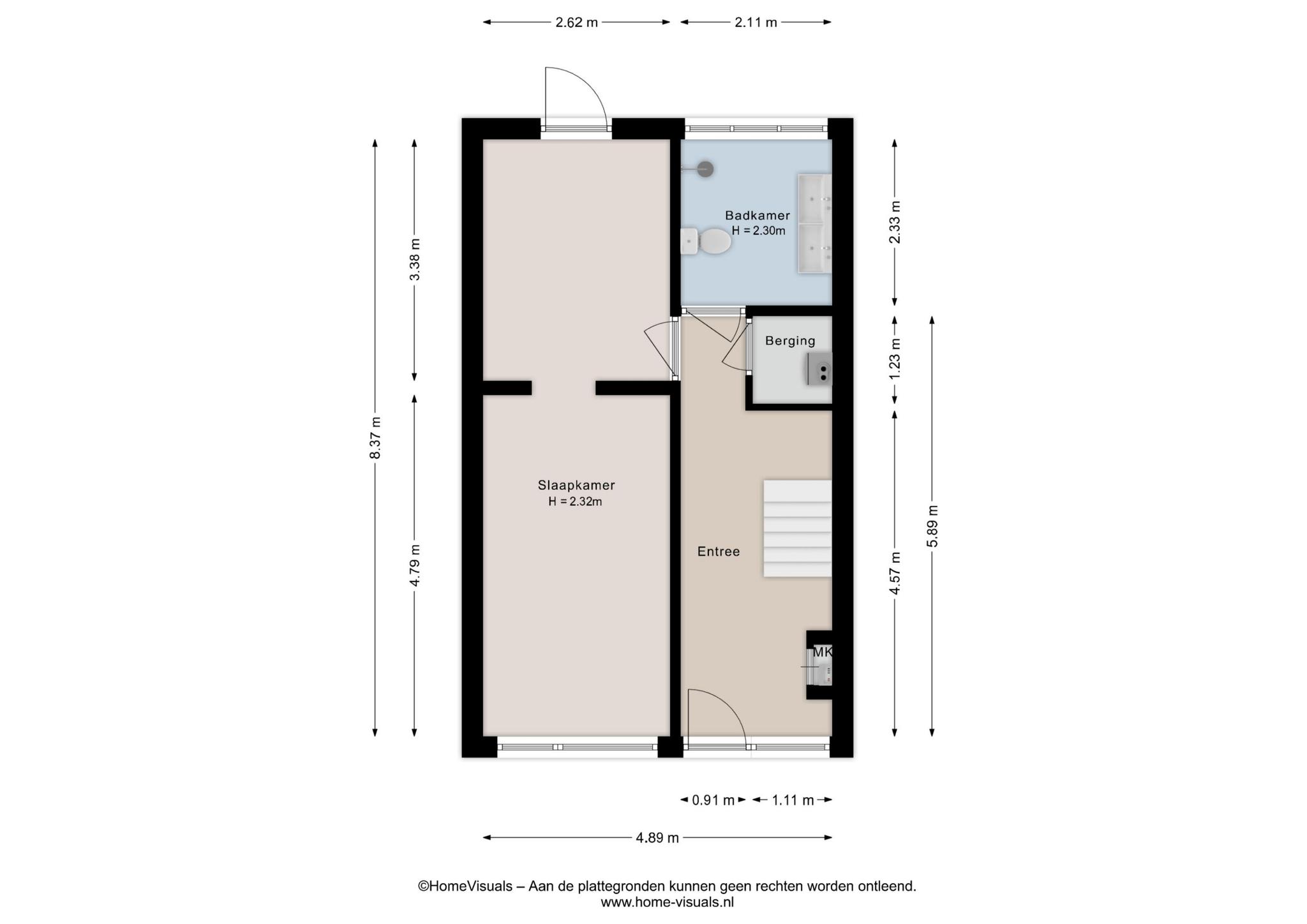 Entree, hal met meterkast, berging en trapopgang. Toegang tot een ruime werk-/ slaapkamer met aan de achterzijde toegang tot de tuin. Ook is hier een ruime badkamer met dubbele wastafel, toilet en inloopdouche.