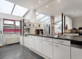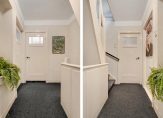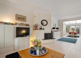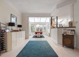 Klassieke hal en gang met traditionele tegelvloer, toilet, sfeervolle en ruime living met erker en serre, open haard en half-open keuken met bar en inrichting in lichte kleurtelling met marmeren hal en apparatuur.