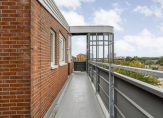 Aan het einde van de gang komt u in de fraaie en royale living met hoog plafond en gashaard. Het appartement is ruim opgezet en beschikt over hoog, hellend dak met grote raampartijen die zorgen voor veel daglicht in de living en de keuken. Aansluitend bevindt zich het balkon.