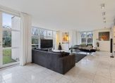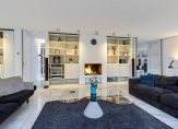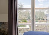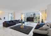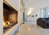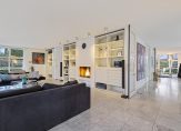 De westvleugel van de villa beschikt over een speelse living met schouw en moderne gas-openhaard, veel licht en uitzicht over de tuin en het landschap.