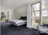 De open trap naar de vide en de omloop geeft toegang tot een master bedroom met eigen badkamer met een comfortabel ligbad, veilige en ruime douche, een nieuwe toilet en een wastafelmeubel met wastafels en een balkon.