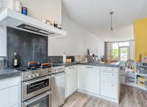 Binnenkomst via de hal met meterkast, moderne toiletruimte en trapopgang. De lichte woonkamer is tuingericht en heeft een prettig uitzicht op de achtertuin met overkapping. De grote raampartijen zorgen voor veel daglicht en een fijne sfeer. Aan de voorzijde bevindt zich de moderne keuken, uitgerust met een robuust betonnen aanrechtblad en hoogwaardige inbouwapparatuur zoals een groot gasfornuis met grillplaat, koel-vriescombinatie, diverse ovens en een Quooker.